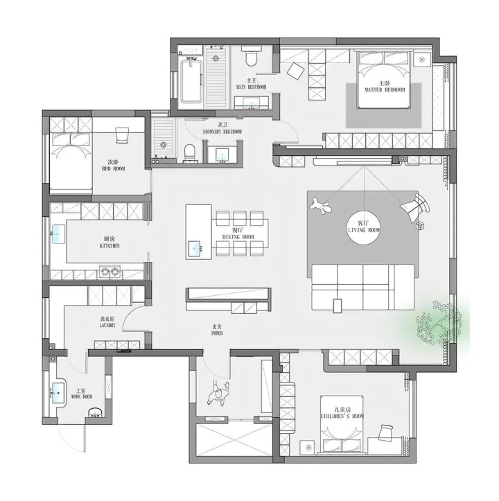 卧室中依旧以温暖的白色为主题,然而这白色中透着阳光的馨香。一大片的落地窗将洋洋阳光灌注室内,明媚与生机在此时得以完美诠释。